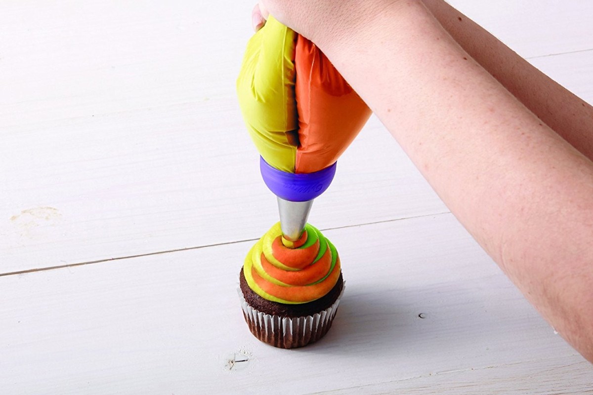 The Colour Swirl 3-Colour Coupler seamlessly blends 2-3 colour icings as you pipe. Choose from double swirl or triple swirl colours. The interlocking coupler pieces connect multiple decorating bags, allowing you to swirl 2 or 3 colours together with one simple piping motion. Just connect and secure with the included ring. Perfect for cupcakes. Works with large tips and piping bags.